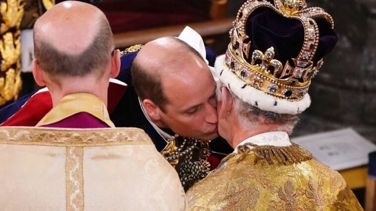 Prinz William (40) stand während der feierlichen Prozedur als Thronfolger an der Seite seines Vaters und trug die Huldigung an das königliche Blut vor, bevor er vor ihm niederkniete. In einem herzlichen Moment nach der Krönung gab William seinem Vater Charles einen Kuss, und der Monarch schien gerührt und kämpfte möglicherweise mit den Tränen.